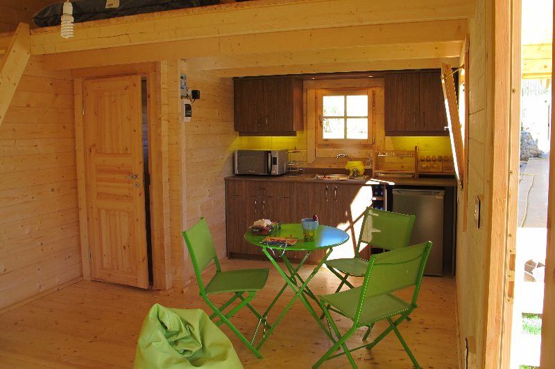 A camping hut with upstairs a sleeping platform