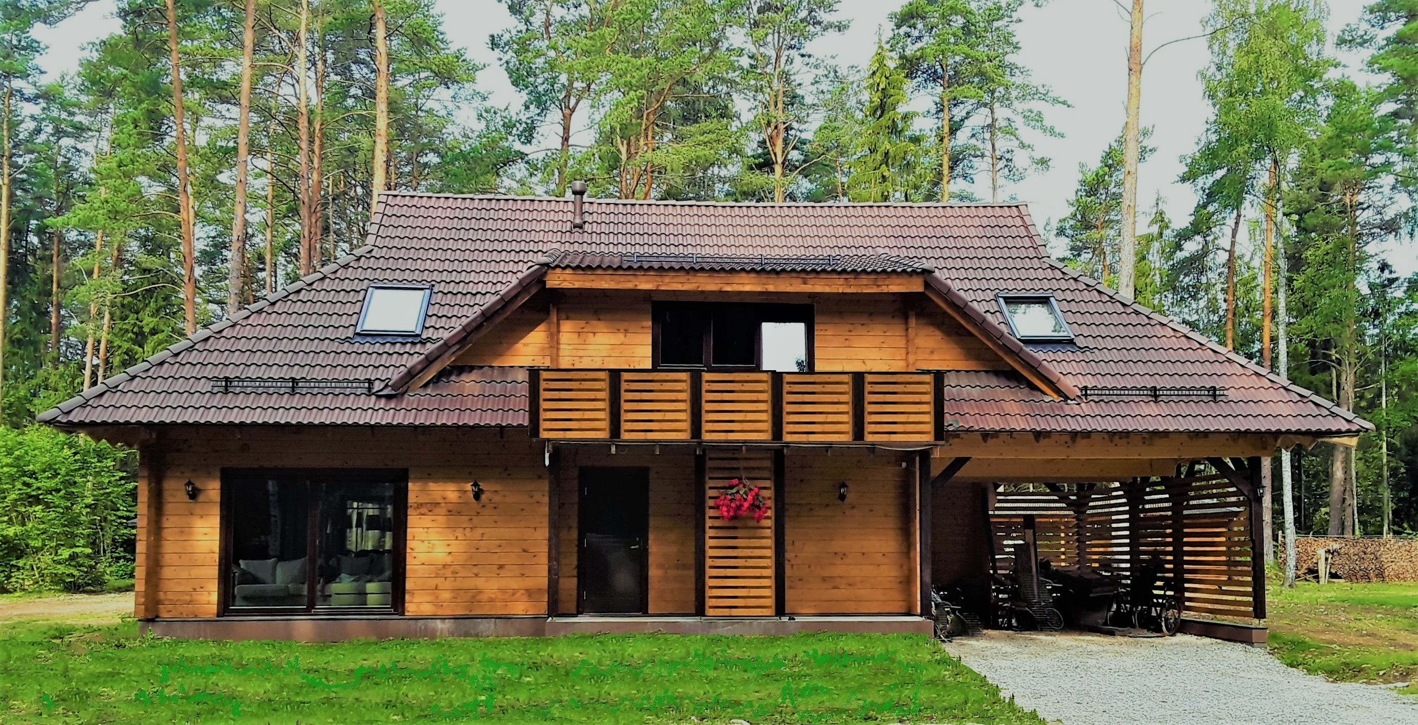 Felz 200m2 2 story building with or without balcony. The classic roof style with attached double garage is making this house one of the most popular ones. Let us know for what variation you are looking for and we will make a quote accordingly. The photos are showing different versions clients have modified.
