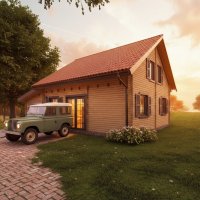 Bretagne 66 sqm plus garage This house has been built as a home for a retired client. His wish was to have an attached garage to the house and the option to build later guest quarters upstairs. This house can be produced as twin skin house or as "hybrid log cabin" both have excellent u values. Some of the pictures are AI modified to show different options and colour choices